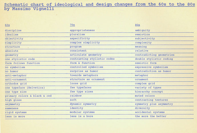 It surprises no one that the side of 60s design that Vignelli decides to focus on is the modularity and rigid systematization that he specialized in.