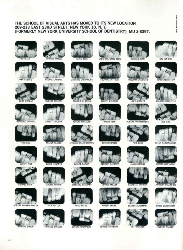 The above is Bob Gill’s dramatically colorized poster announcing SVA’s relocation to 209 E 23rd Street in 1960 (where the main building remains to this day). Previously the school occupied a building at the corner of 2nd Ave and 23rd Street (half a block away). The alternate poster, by Jack Beck, riffs on what previously occupied the new location: